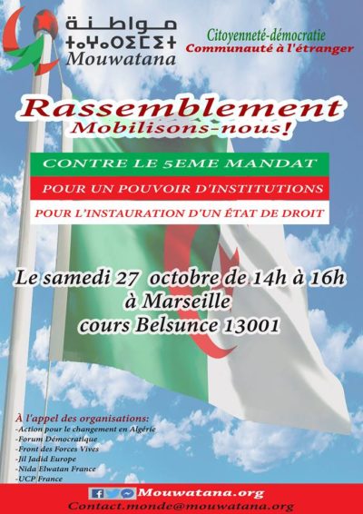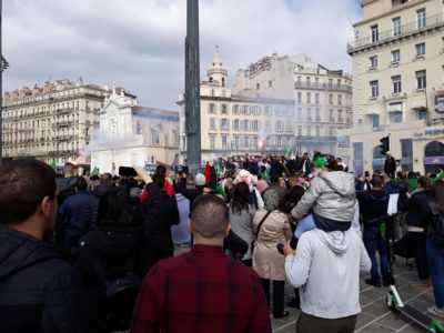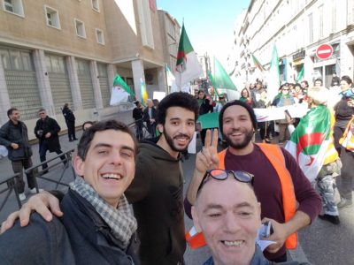 Nassim Bendali membre du Conseil National et responsable Jil Jadid Marseille : pour Marseille, l’équipe qui avait œuvré au sein de Mouwatana a été un élément facilitateur en termes de mobilisation notamment sur les réseaux sociaux. Via Facebook, une page est créée (Mon Algérie Marseille) par laquelle des appels aux rassemblements sont lancés à la diaspora de la région marseillaise. Le premier appel fut lancé le 17 février et allait continuer pour tous les dimanches suivants. Les Algériens ont répondu en nombre croissant de dimanche en dimanche. Le 1er rassemblement a eu lieu à la porte d’Aix et de semaines en semaines à plusieurs endroits à Marseille comme le Vieux Port, La Canebière (les réformés).