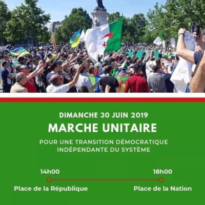 Nassim Bendali : À la fin du mois d’août 2019, et afin de faire en sorte que la mobilisation de la diaspora ne fléchisse pas au sortir de l’été, Jil Jadid Europe a même pris l’initiative de proposer aux collectifs et organisations de la diaspora de cosigner un texte commun destiné à sonner la mobilisation générale de la diaspora et d’appeler collectivement à un grand rassemblement pour le dimanche 22 septembre à Paris République. Le texte d’appel que nous leur proposerons sera ainsi signé par 16 organisations.
