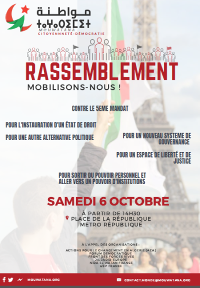 Europe : Dès le 17 février, on avait proposé aux autres organisations membres de Mouwatana à Paris de préparer ensemble un rassemblement pour le 24 février à la place de la République. A l’appui de cette idée, nous avons proposé un projet d’appel qui a été adopté par un certain nombre d’associations et de partis politiques algériens représentés en France.